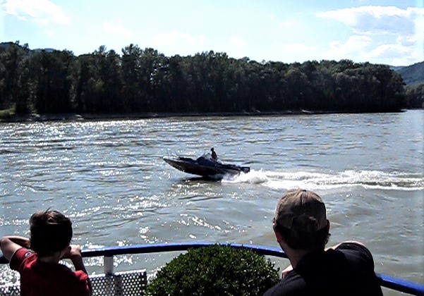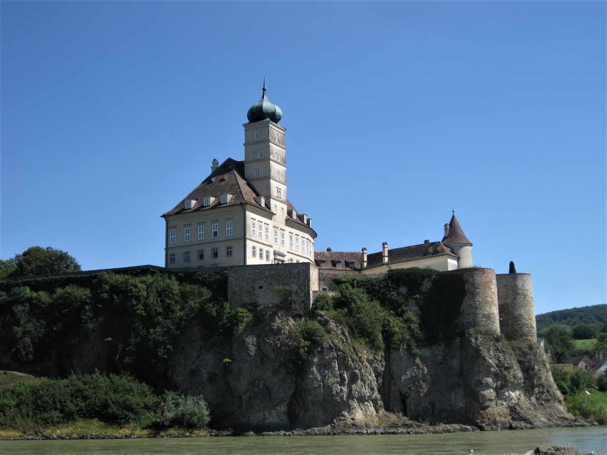 ドナウ川の「バッハウ渓谷」両岸の岩肌と、そこに張り付くような古城、寺院のたたずまい。ふもとの街並みとブドウ畑・・・・・水上を行き交う船、モーターボート・・・