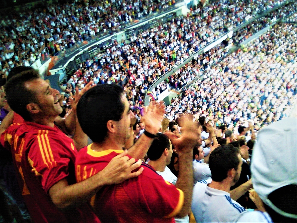 (23日つづき)トレドをあとにして、バスにてマドリードへ。ホテルに戻り、近くのカルフール(スーパー)へ夕食(サンドイッチとビール)の買い出しに。今晩は、いよいよ待望のレアル・マドリードのゲーム観戦だ! バスにてレアルのホームスタジアム:サンチャゴ・ベルナベウへ向かう。ご一緒するのは新婚さんのおふたりと叶姉妹(と、ひそかに名付けた美人姉妹)、一人旅の森川氏ほかだ。新婚さんはお揃いのレアルの白いユニフォーム姿に着替えて気合が入っている。レアルサポーターだらけの人ごみをかき分けて46番ゲートから入場、親切な案内に従って2階席に着席。スタジアムはゲーム開始前からの応援合戦ですでに大盛り上がりだ。さすがこれが世界トップクラスのサッカー大国という雰囲気だ。