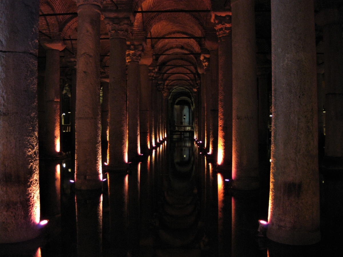 シルバーのカラーリングの新車のトラムは冷房が効いている、涼しい――!スルタンマホメット駅下車、アヤソフィアを横目に地下宮殿を目指す。地下宮殿、そこは歴史の迷宮。背中がゾクゾクする感覚が・・、冷たそうな地下水には鯉のむれ、ライトアップされた異空間。メビウスの逆さ首、涙目の柱。