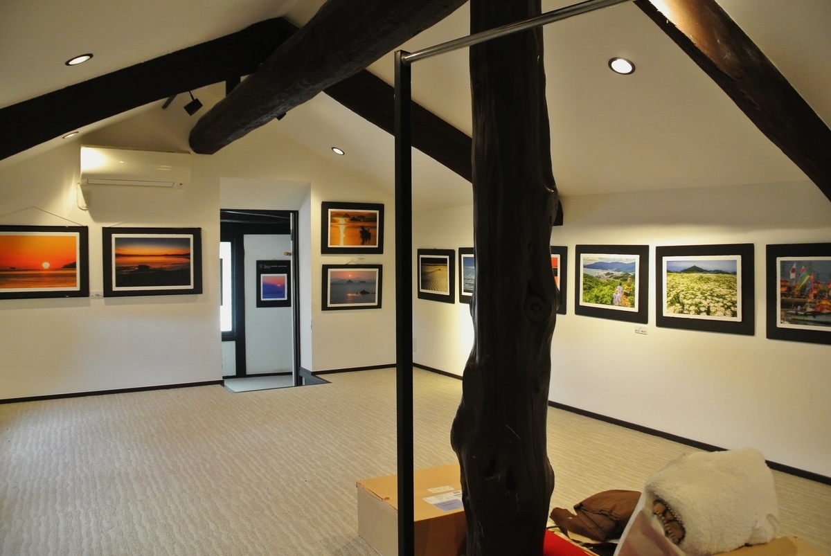 別棟(蔵?)では地元の写真家「二宮博之氏」の写真展開催中、ご本人の解説で見学をさせていただく。 瀬戸内海シリーズなどの作品は、「和紙に印刷」した写真ということで、とても柔らかい味がある。なるほどこういう手法があるんだな、という発見。絵葉書を記念にいただく。