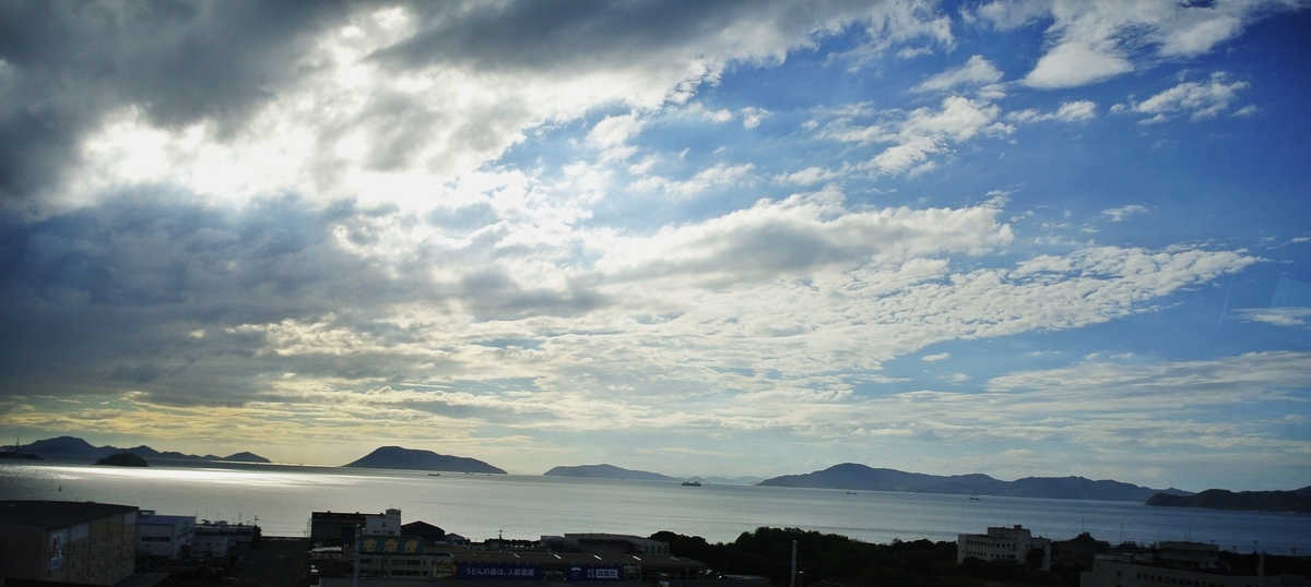 右手には、瀬戸内海で「淡路島」に次ぐ大きさの 「小豆島」。ここは「 二十四の瞳」の舞台でもあり、近年「魔女の宅急便」実写版のロケ地になった。